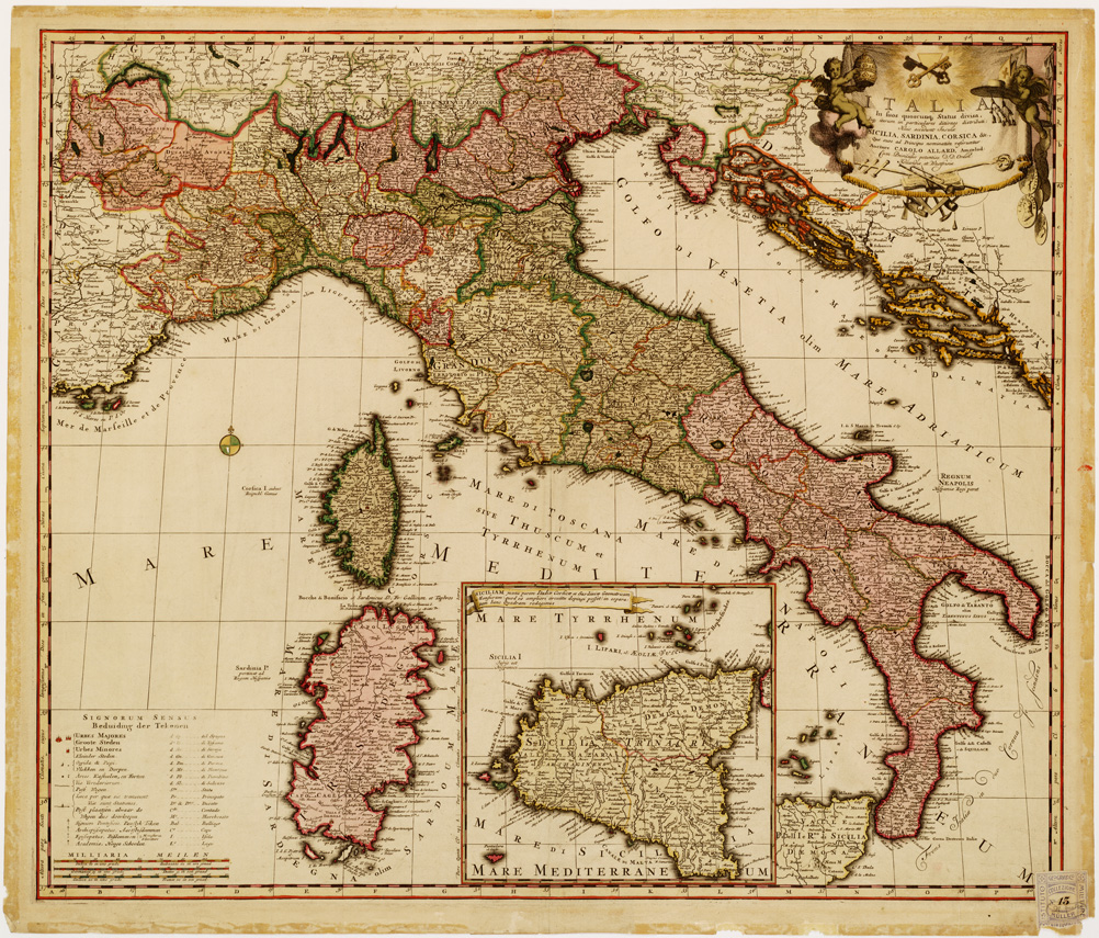 "...AUCTORE CAROLO ALLARD. AMSTELOD. (s. d.). Incisione su rame, senza rappresentazione orografica, con toponomastica molto ricca ma non troppo chiara per la minutezza dei caratteri. Le longitudini provengono dall'isola del Ferro. I territori dei vari stati sono distinti a colori. La Sicilia è inserita in una cartina sussidiaria. La carta è corredata di una leggenda dei segni e delle abbreviazioni convenzionali. Cfr. la stessa carta al n. 23 d'Ordine - Coll. Muller n. 14 - File B0014069."