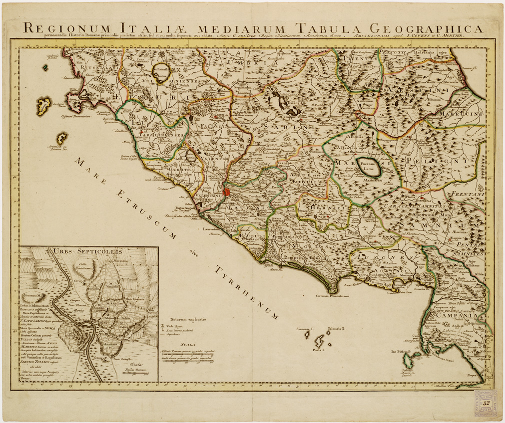 "...PERNOSCENDIS HISTORIAE ROMANAE PRIMORDIIS PRAESERTIM UTILIS SED ET CUI MULTA SEQUIORIS AEVI ADDITA. AUTORE G. DELL'ISLE. REGIA SCIENTIARUM ACADEMIA SOCIO. AMSTELODAMI, APUD I COVENS ET C. MORTIER. Incisione su rame in un sol foglio. Comprende l'Italia centrale entro i limiti: nord, Spoletium sud, Pompeii. Orografia prospettica a monticelli. Sono tracciate le vie romane coi loro nomi. Sono distinte le selve e le zone paludose sono indicati gli acquedotti. I principali abitati sono rappresentati schematicamente in prospettiva. La toponomastica è in latino. Le divisioni territoriali sono a colori. In basso a sinistra trovasi una cartina di Roma ("Urbis Septicollis"), con note, e scala grafica in passi romani. Le longitudini sono riferite all'isola del Ferro. Le scale grafiche sono calcolate in miglia romane e in stadia di Grecia. (B10)"