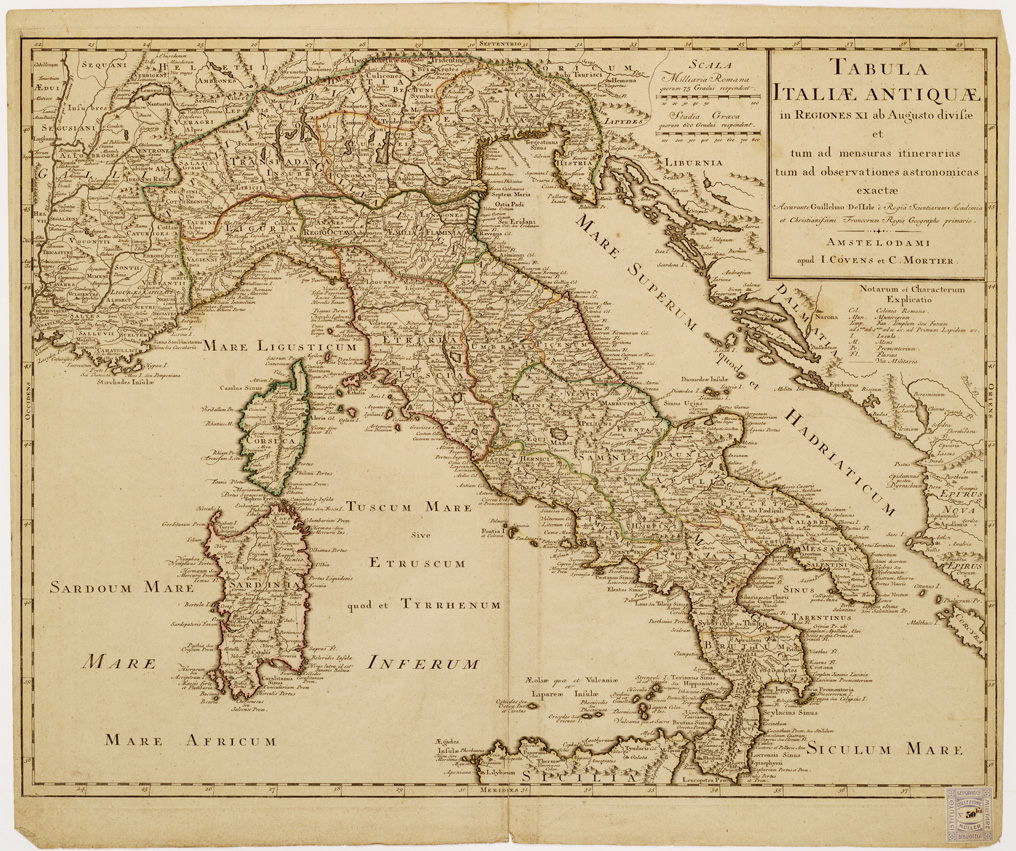 "...AB AUGUSTO DIVISAE ET TUM AD MENSURAS ITINERARIAS TUM AD OBSERVATIONES ASTRONOMICAS EXACTAE. ACCURANTE GUILLELMO DEL'ISLE E' REGIA SCIENTIARUM ACADEMIA ET CHRISTIANISSIMI FRANCORUM REGIS GEOGRAPHO PRIMARIO. AMSTELODAMI APUD I. COVENS ET C. MORTIER. La stessa carta di cui al N° 33 d'ordine (Coll. Muller, N° 30 - File B0007246) con le divisioni politiche dei territori a colori. Cfr. G. MARINELLI, Saggio, ecc., N° 1061. Dello stesso autore anche la carta "NOVA ITALIAE DESCRIPTIO..." - Coll. Muller n. 20 - File B0007262."