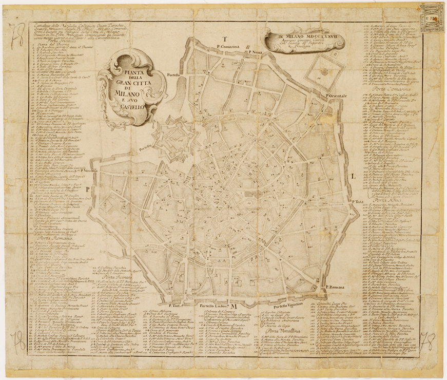 PIANTA DELLA GRAN CITTA' DI MILANO E SUO CASTELLO. IN MILANO MDCCXXXVII APPRESSO GIUSEPPE CAIROLO CON LICENZA DE SUPERIORI & PRIVILEGIO.