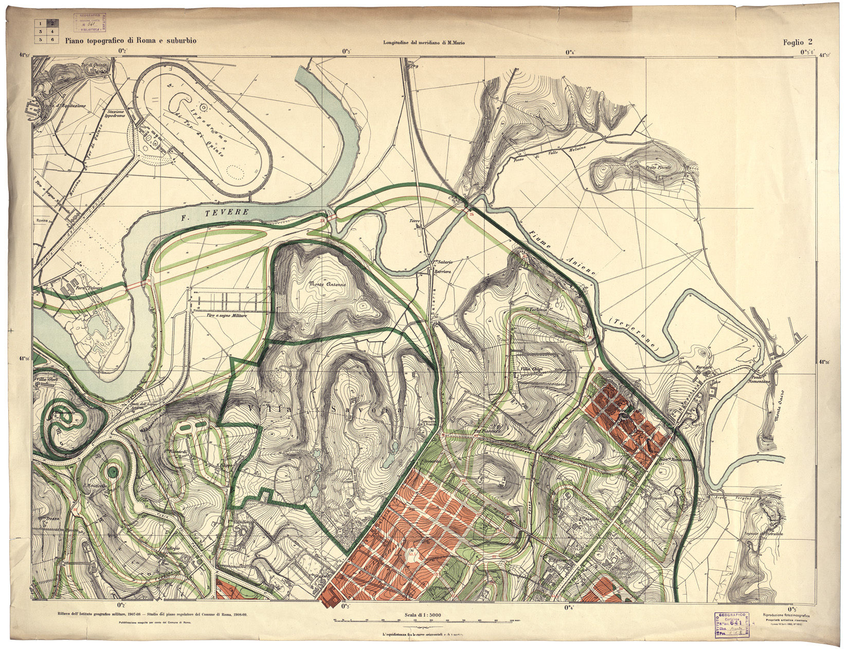 "ALLA SCALA DI 1:5.000. ALLA SCALA DI 1:5.000. EDIZIONE UFFICIALE. RILIEVO DELL'I.G.M. 1907-08. STUDIO DEL PIANO REGOLATORE DEL COMUNE DI ROMA. 1908-09. Pubblicazione eseguita per conto del Comune di Roma in cinque fogli. Due copie una delle quali a colori e una in nero mancante delo foglio n. 3. Il foglio n. 1 contiene il titolo e la leggenda dei segni e dei colori convenzionali. Orografia a curve tracciate alla equidistanza di 1 m. Il piano segnato col N. 1805 d'Inv. è alla scala di 1:10.000 (File B0007143-48). Cfr. la carta in bianco e nero è conservata nella Cartella d'Archivio n. 70 - Doc. 24."