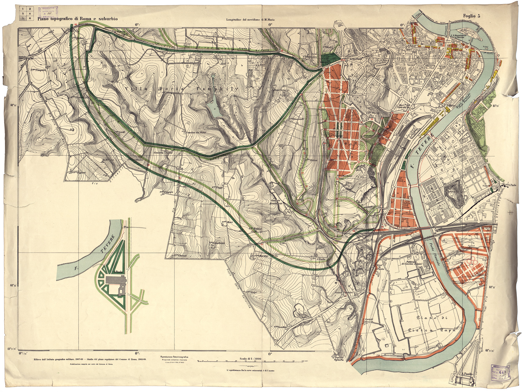 "ALLA SCALA DI 1:5.000. ALLA SCALA DI 1:5.000. EDIZIONE UFFICIALE. RILIEVO DELL'I.G.M. 1907-08. STUDIO DEL PIANO REGOLATORE DEL COMUNE DI ROMA. 1908-09. Pubblicazione eseguita per conto del Comune di Roma in cinque fogli. Due copie una delle quali a colori e una in nero mancante delo foglio n. 3. Il foglio n. 1 contiene il titolo e la leggenda dei segni e dei colori convenzionali. Orografia a curve tracciate alla equidistanza di 1 m. Il piano segnato col N. 1805 d'Inv. è alla scala di 1:10.000 (File B0007143-48). Cfr. la carta in bianco e nero è conservata nella Cartella d'Archivio n. 70 - Doc. 24."