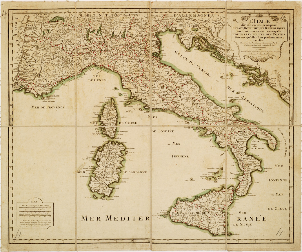 "...REMARQUEES TOUTES LES ROUTES DES POSTES SUIVANT QU'ELLES SONT PRESENTEMENT ETABLIES. DRESSEE SUR LES MEMOIRES LES PLUS NOUVEAUX. PAR LE SR. JAILLOT GEOGRAPHE ORDINAIRE DU ROY. A PARIS CHEZ L'AUTEUR, ECC. Carta incisa su rame in un sol foglio, montata su tela a stacchi. Rappresenta le vie postali con linee spezzate e puntini. Una nota avverte che ogni tratto corrisponde a una lega e ogni puntino a un quarto di lega. Le scale grafiche sono calcolate in miglia d'Italia, leghe comuni di Francia e grandi leghe di Francia. Orografia prospettica a monticelli. Toponomastica in francese."