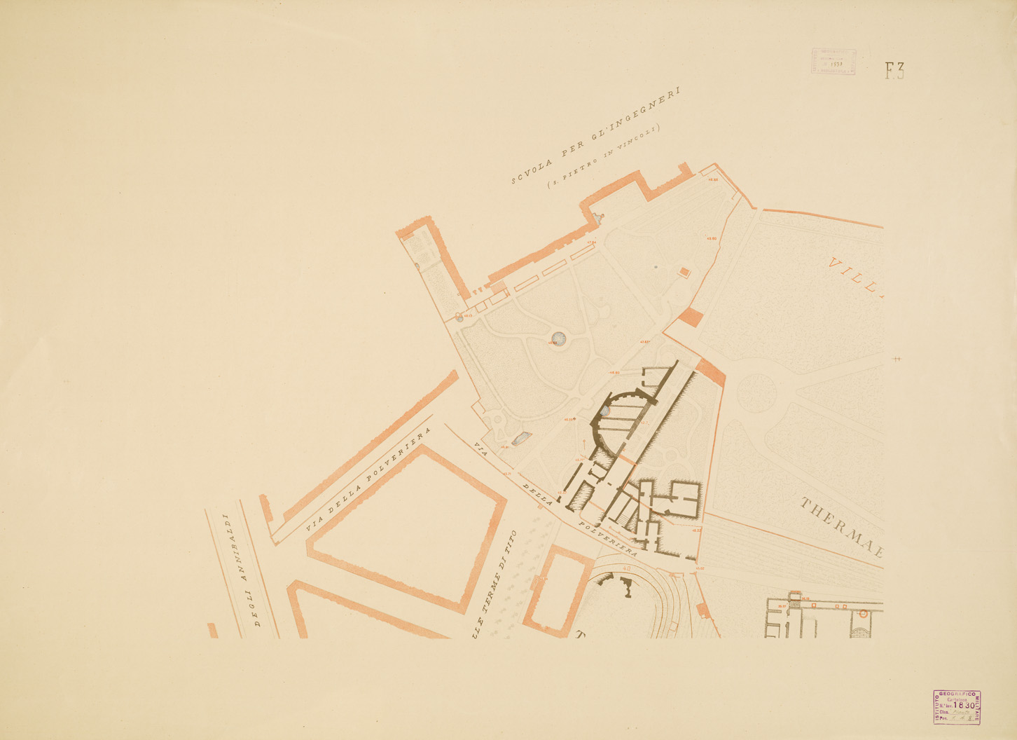 "...RILIEVO PLANIMETRICO ED ALTIMETRICO ESEGUITO DAGLI ALLIEVI DELLA SCUOLA D'APPLICAZIONE PER GLI INGEGNERI IN ROMA COLLA GUIDA DEL PROF. U. BARBIERI E DELL'ING. C. CASSINIS. ROMA, MAGGIO 1910. I.G.M. (FI),, 1911. Bella carta in quattordici fogli oltre il foglio titolo e il quadro d'unione, riprodotti in fotozincografia in cromo eseguita dall'I.G.M. per conto dell'Accademia. Cfr. Cart. d'Arch. n. 70 Docum. n. 25 (file A0001343-59)."