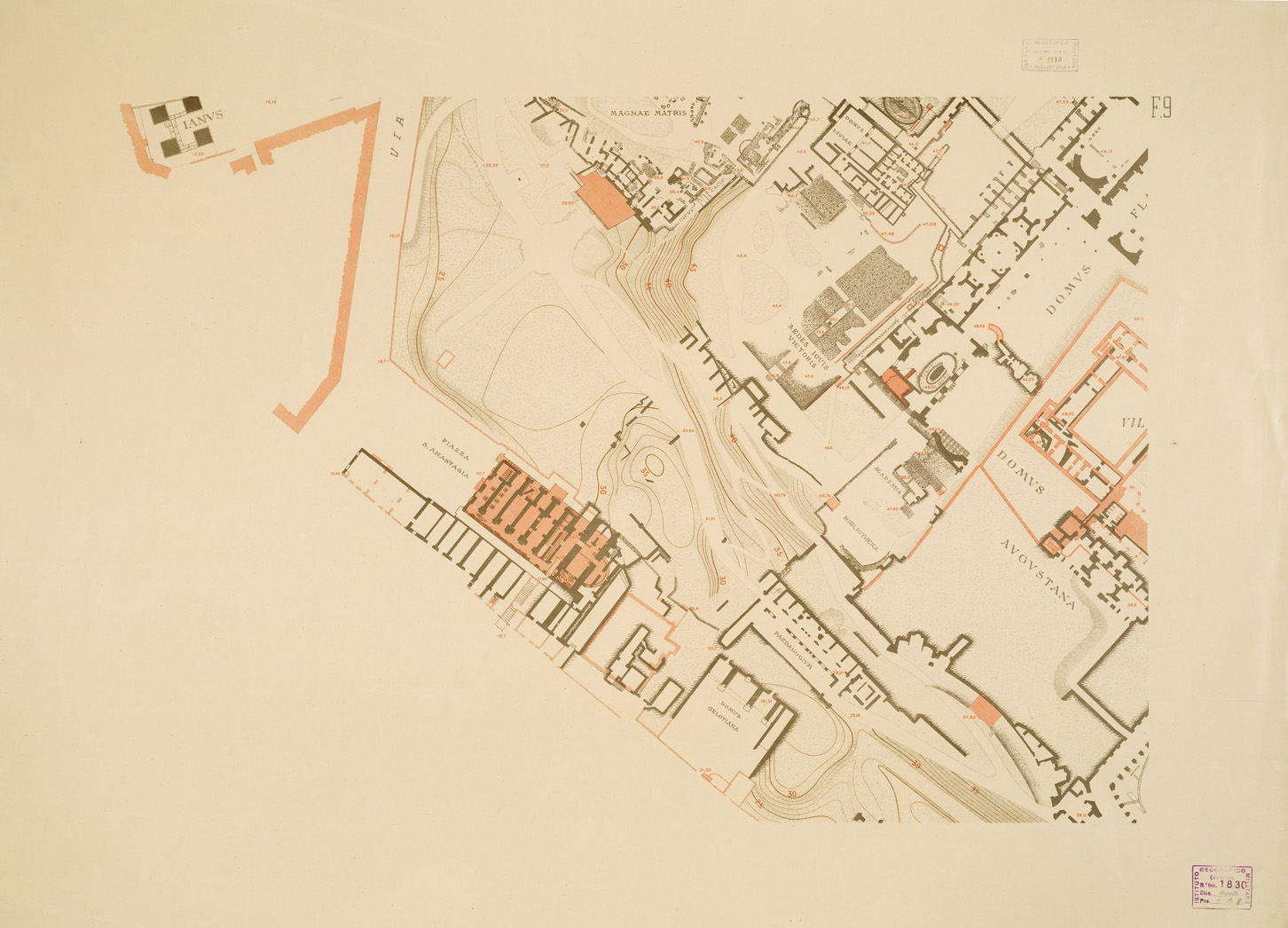 "...RILIEVO PLANIMETRICO ED ALTIMETRICO ESEGUITO DAGLI ALLIEVI DELLA SCUOLA D'APPLICAZIONE PER GLI INGEGNERI IN ROMA COLLA GUIDA DEL PROF. U. BARBIERI E DELL'ING. C. CASSINIS. ROMA, MAGGIO 1910. I.G.M. (FI),, 1911. Bella carta in quattordici fogli oltre il foglio titolo e il quadro d'unione, riprodotti in fotozincografia in cromo eseguita dall'I.G.M. per conto dell'Accademia. Cfr. Cart. d'Arch. n. 70 Docum. n. 25 (file A0001343-59)."