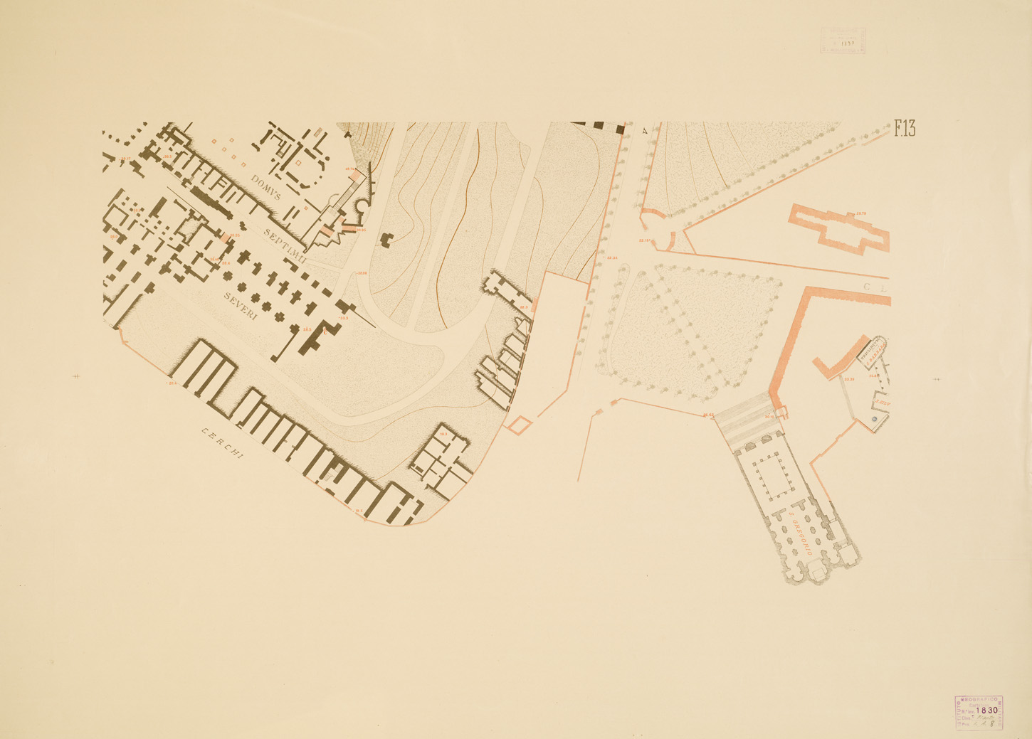 "...RILIEVO PLANIMETRICO ED ALTIMETRICO ESEGUITO DAGLI ALLIEVI DELLA SCUOLA D'APPLICAZIONE PER GLI INGEGNERI IN ROMA COLLA GUIDA DEL PROF. U. BARBIERI E DELL'ING. C. CASSINIS. ROMA, MAGGIO 1910. I.G.M. (FI),, 1911. Bella carta in quattordici fogli oltre il foglio titolo e il quadro d'unione, riprodotti in fotozincografia in cromo eseguita dall'I.G.M. per conto dell'Accademia. Cfr. Cart. d'Arch. n. 70 Docum. n. 25 (file A0001343-59)."