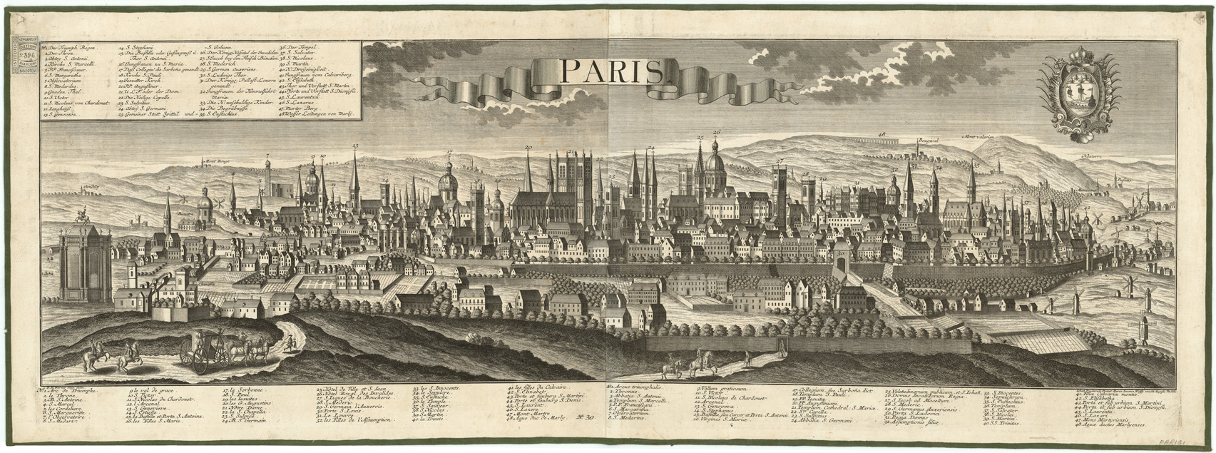 "Epoca fine secolo XVIII.Dimensioni cm 31x 100. Prospetto di Milano. " F. B. Werner delin. Joh Fried Probst excud. Aug. Vind ". In basso un elenco numerico dei principali edifici. Incisione su rame. Foglio unico montato su tela. Fa parte di un gruppo di sette carte dello stesso A. e dello stesso incisore."