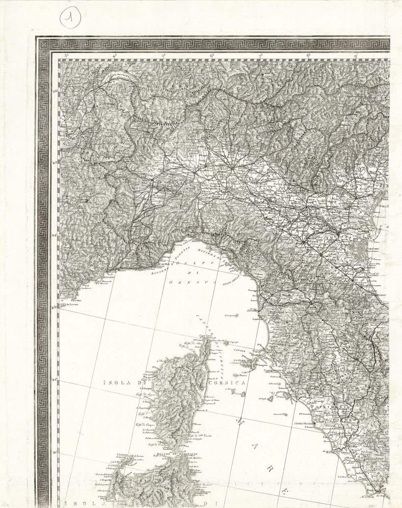 NUOVA CARTA DELL'ITALIA ESEGUITA SOTTO LA DIREZIONE DI GIO. ANTONIO RIZZI-ZANNONI, GEOGRAFO DI S. M. SICILIANA INCISA DA GIUSEPPE GUERRA E RICORRETTA NEL 1833 - Tavola 1