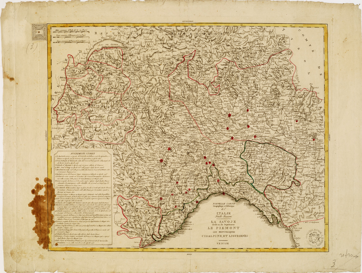 "...LES REPUBLIQUES CISALPINE ET LIGURIENNES. Questa carta fa parte insieme ad altre tre della "NOUVELLE CARTE GEOGRAPHIQUE ET HISTORIQUE DE L'ITALIE VENEZIA. (s. a. s. d.)". Si tratta di una incisione su rame, nel catalogo Ragionato alle pagine 27 e 28, viene così descritta: il primo foglio mostra l'orografia prospetticamente mediante il sistema a monticelli. Gli altri tre fogli con un tratteggio assai schematico e primitivo i confini politici sono a colori. E' tracciata la rete stradale. La toponomastica è in italiano eccetto i nomi regionali, dei mari, ecc. scritti invece in francese. Ciascun foglio reca un quadro cronologico dei principali avvenimenti storici, relativi a varie località per il periodo 1796-1800, scritto in italiano. Su ognuno sono riportate tre scale grafiche in misure antiche. "