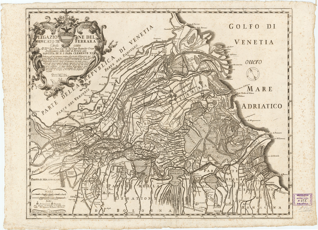 "DEDICATA ALL'ILL.MO DIG.RE,ecc.,ecc., CONTE EUSTACHIO CRISPI AMBASCIATORE DELLA CITTA' DI FERRARA ALLA SANTITA' DEL N. S. CLEMENTE XI,ecc.,ecc., LORENZO FILIPPO DE ROSSI. DATA IN LUCE DA DOMENICO DE ROSSI DALLE SUE STAMPE IN ROMA ALLA PACE CON PRIV. DEL SOMMO PONT. L'ANNO 1709. Incisione su rame in foglio unico. Orientazione : il nord è spostato verso sinistra.Longitudini calcolate dal meridiano delle isole di Capo Verde. Abitati principali rappresentati in pianta : gli altri con torri e case sono distinti gli arcivescovadi e i vescovadi. Due scale grafiche in miglia italiane e in leghe comuni di Francia. Cfr. anche la stessa carta al numero di File B0002391 - Coll. Bianconi n. 183."