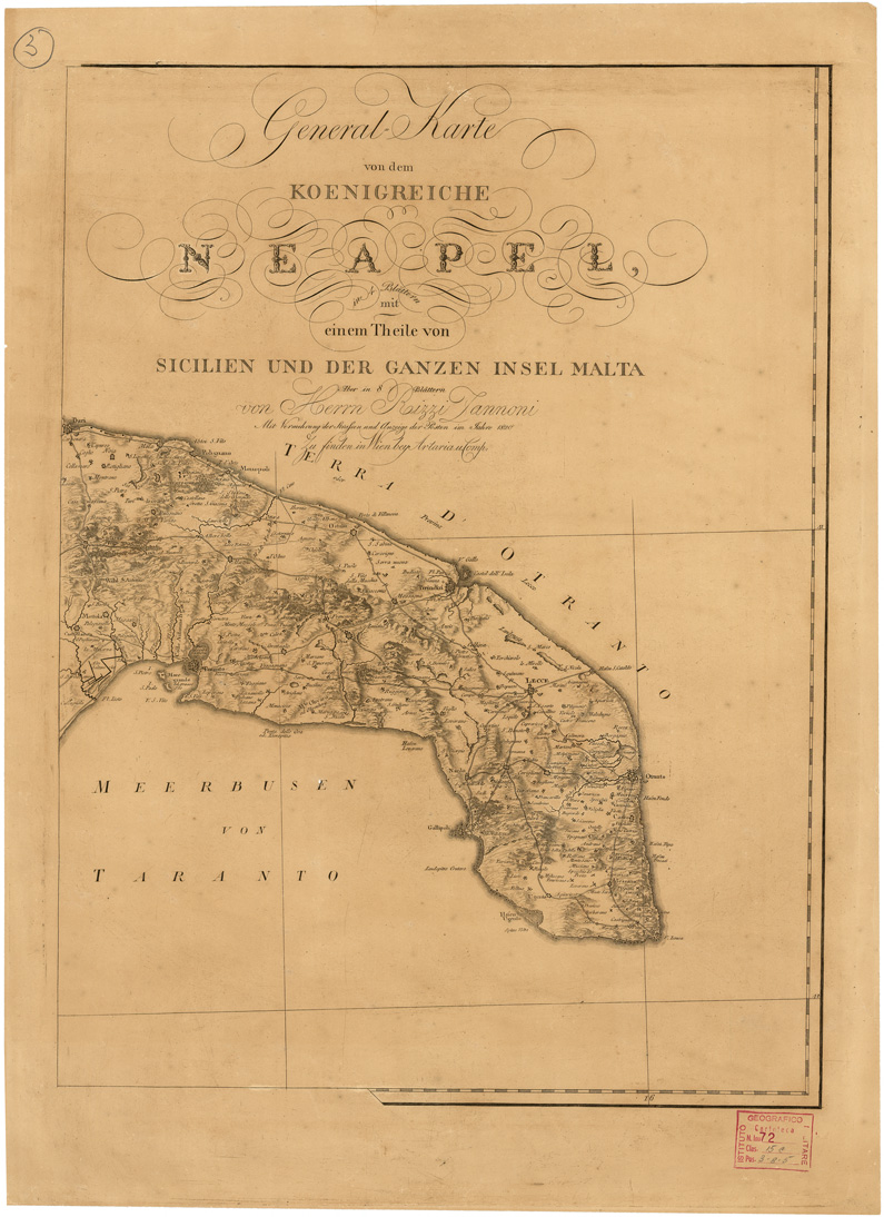 "...IN 4 BLATTERN MIT EINEM THEILE VON SICILIEN UND DER GAUZEN INSEL MALTA ABER IN 8 BLATTERN VON HERRN RIZZI ZANNONI MIT VERMEHRUNG DER STRASSEN UND AUZEIGE DER POSTEN IM JAHRE 1820 ZU FINDEN IN WIEN BEY ARTARIA U. COMP.. ...E L'ISOLA DI MALTA DA RIZZI ZANNONI PUBBLICATA E VENDIBILE IN VIENNA PRESSO ARTARIA E COMPAGNI MDCCCVI. Grande carta incisa su rame composta dei quattro fogli della edizione austriaca completati da altri 4 fogli, riuniti e montati su tela a stacchi. In basso a destra cartina supplementare per l'isola di Malta e di Gozo alla scala 1:185.000 circa. Questa è la copia n. 72 d'inv. gen. che si compone dei soli 4 fogli, duplicati, della edizione austriaca: essi misurano cm. 43x58 entro il campo disegnato: sono stampati in nero tratti da incisione su rame, datati al 1820 - (Files B0007525-28). La carta al n. d'Ordine 26 - Collezione Bianconi n. 254 del 1806-1820, sopra descritta è consultabile ai numeri di Files B0008246-52. "