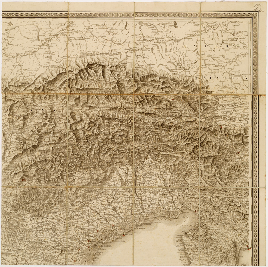 "...COI SUOI STABILIMENTI POLITICI, MILITARI, CIVILI E RELIGIOSI E CON UNA PARTE DEGLI STATI LIMITROFI. COSTRUITA NEL DEPOSITO DELLA GUERRA PER ORDINE DEL MINISTRO DELLA GUERRA E MARINA NELL'ANNO MDCCCXI. AGGIUNTA E CORRETTA NELL'ANNO 1813. LA PRESENTE CARTA E' STATA INCISA SOTTO LA VIGILANZA DEL SIG. G. BORDIGA CAPO INCISORE NEL DEPOSITO DELLA GUERRA. Questa carta è una copia di quella descritta alla pagina 33 del Catalogo ragionato N° 74 d'ordine che è costituita da otto fogli. Questa carta è invece in sei fogli incisi su rame. Proiezione conica. Orientazione normale. Rappresenta l'orografia con fine tratteggio a luce obliqua. Assai ricca di dettagli topografici. Il primo foglio contiene il titolo, la leggenda dei segni convenzionali e una nota sulla costruzione della carta. Il foglio N° 5 contiene un quadro statistico."