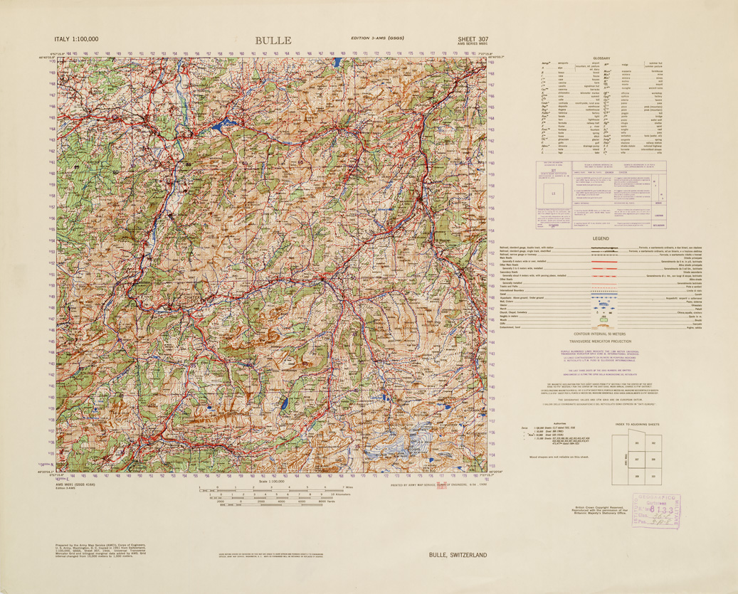 "Autore Army Map. Servige Corp of Engineers. Rappresentazione orografica a curve di livello."