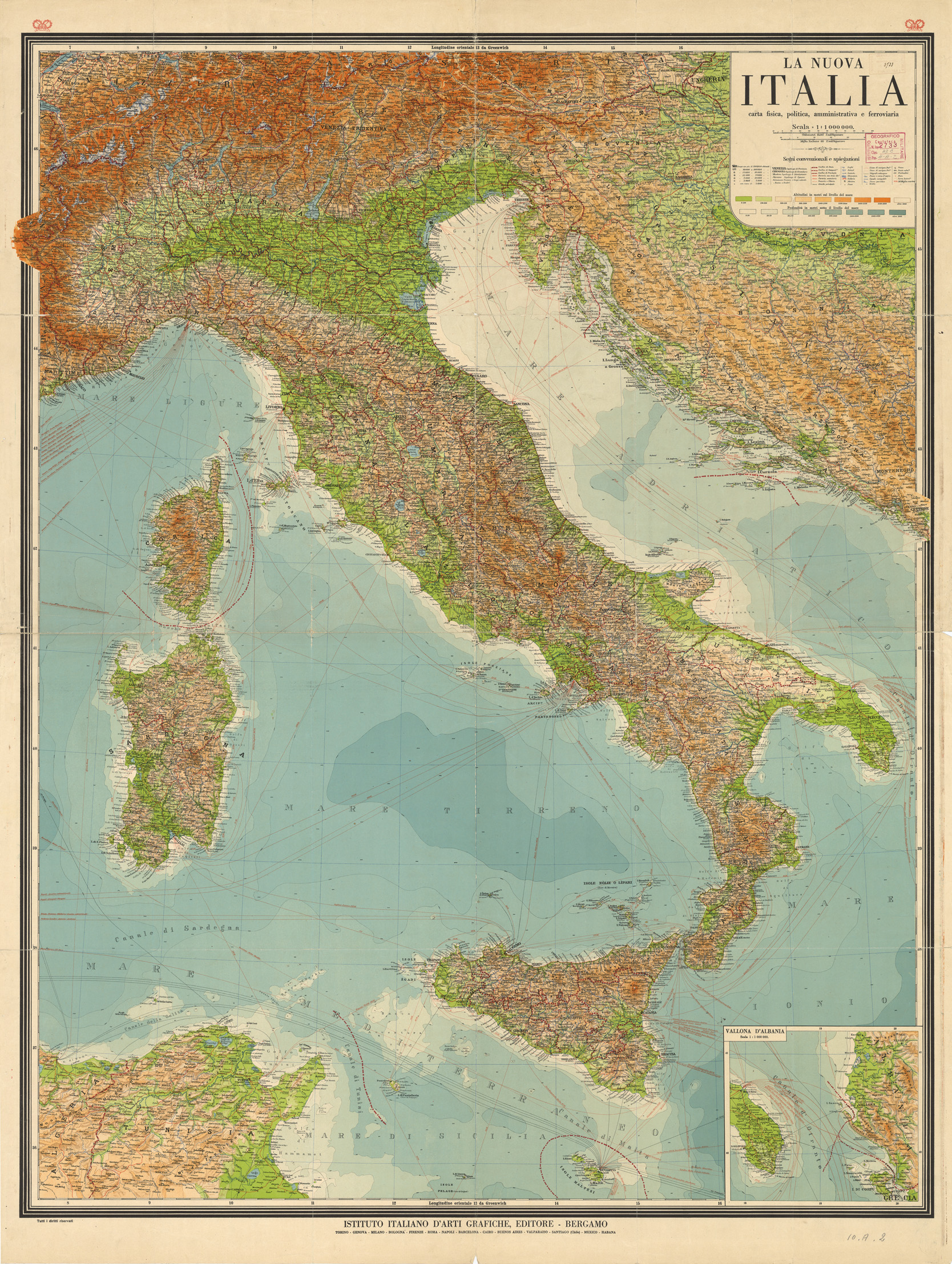 "Autore Istituto Italiano di Arti Grafiche.Rappresentazione orografica a tinte ipsometriche."