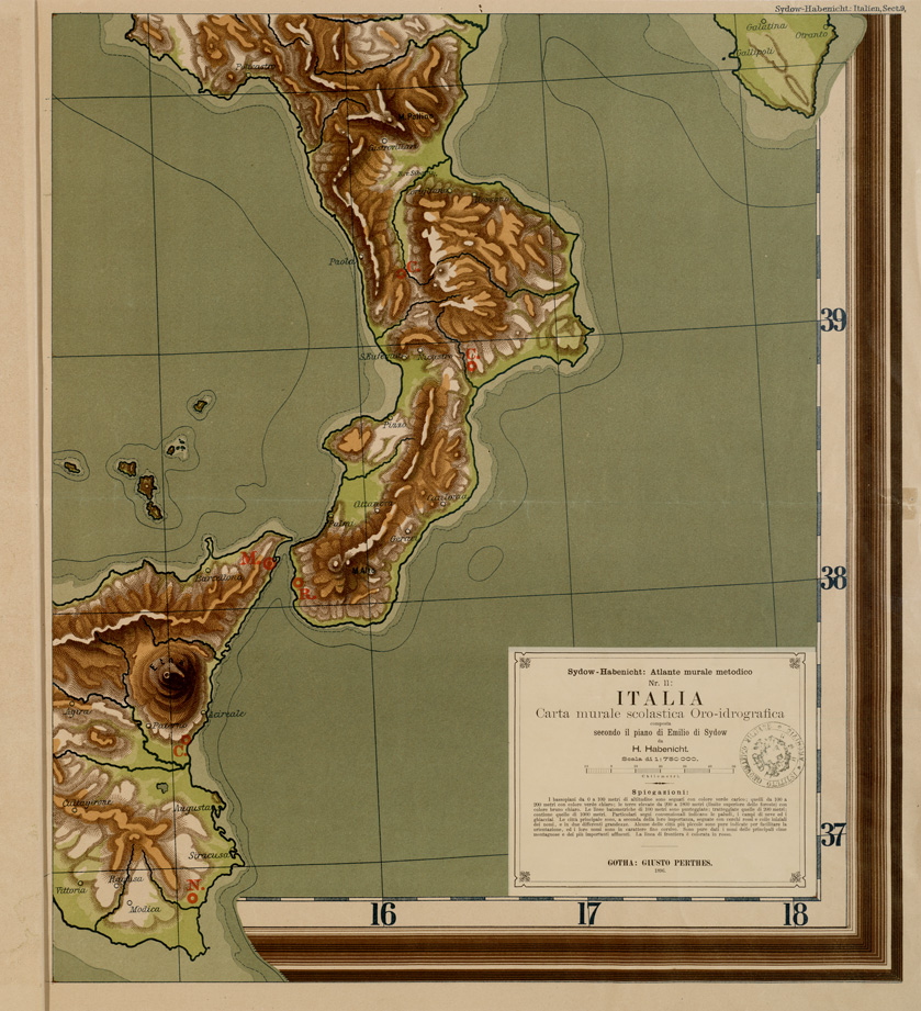 " Autore H. Habenicht.Rappresentazione orografica a tratteggio e tinte ipsometriche.Editore Justus Perthes."