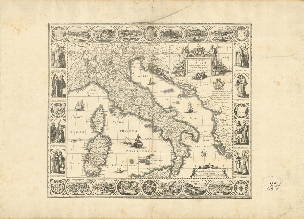 "...NOVA ET ACCURATA DELINEATIO EDITA PER JOANNEM JANSSONIUM. La carta è dedicata alla Repubblica di Venezia. Sopra il lato nord e sotto il lato sud vi sono incise prospettive delle varie città ad est ed a ovest figure nei costumi del tempo.Le longitudini provengono dalle Isole del Capo Verde. Nicolò Jannson d'Abbeville (e prima di lui givanni Jannson) con Adriano e Guglielmo suoi figli, e col nipote Pietro Moulart Jannson, dal 1627 in poi diede impulso e lustro agli studi geografici anche sfruttando i lavori del Magini editi dal figlio Fabio nel 1620."