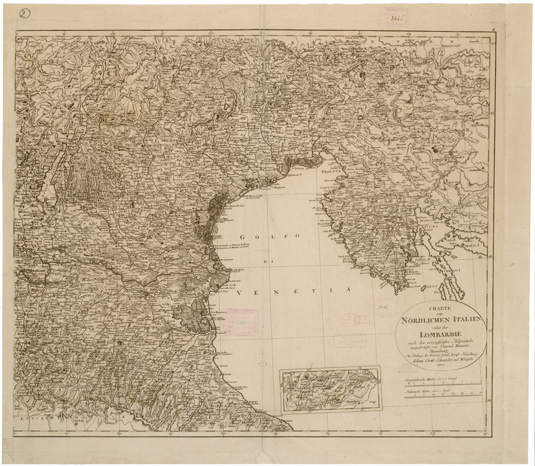"... NACH DEN VORZUGLISHSTEN HISTSMITTELN IN ZWEY IN BLATT AUSGESERTIGET VON CONRAD MANNERT, NURNBERG.IM VERLAGE DER KAISERL PRIVIL KUMPT HANDLUNG ADAM GOLTL SCHNEIDER U WEIGELS. Rappresentazione orografica a tratteggio,grafia in tedesco,italiano.Autore A.Gottl Schneider. Carta derivante da incisione su rame."