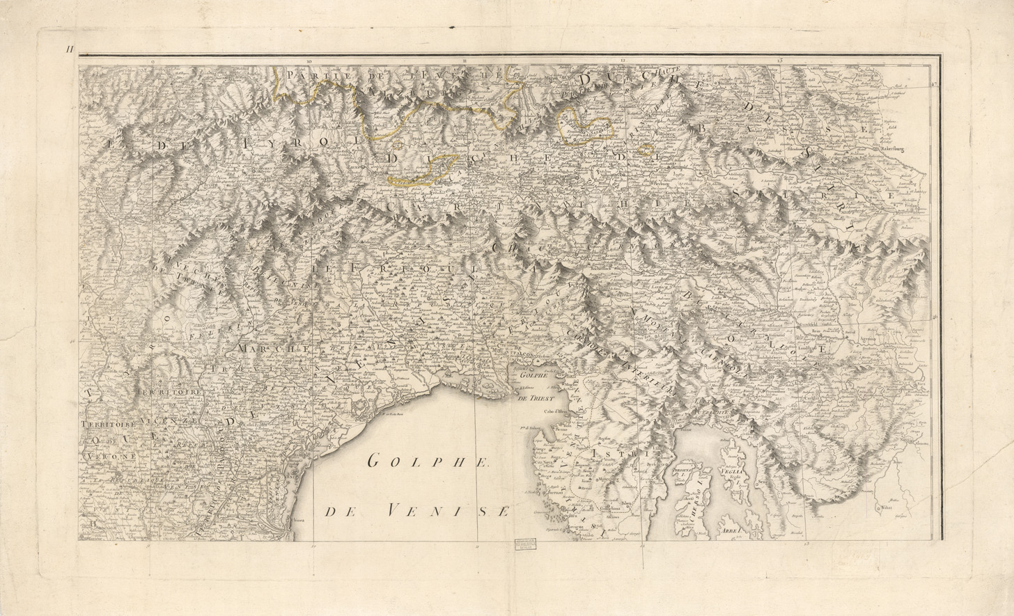 "A Paris chez le spezauche Ing. Geographe. Grafia in francese. Rappresentazione orografica a tratteggio dimostrativo prospettico. Autore M. Chanchard. Nel catalogo ragionato è stata indicata una carta molto simile a questa, essa è costituita da sei fogli montati su tela e appartiene alla collezione Bianconi N.° 31. Carta derivante da incisione su rame."