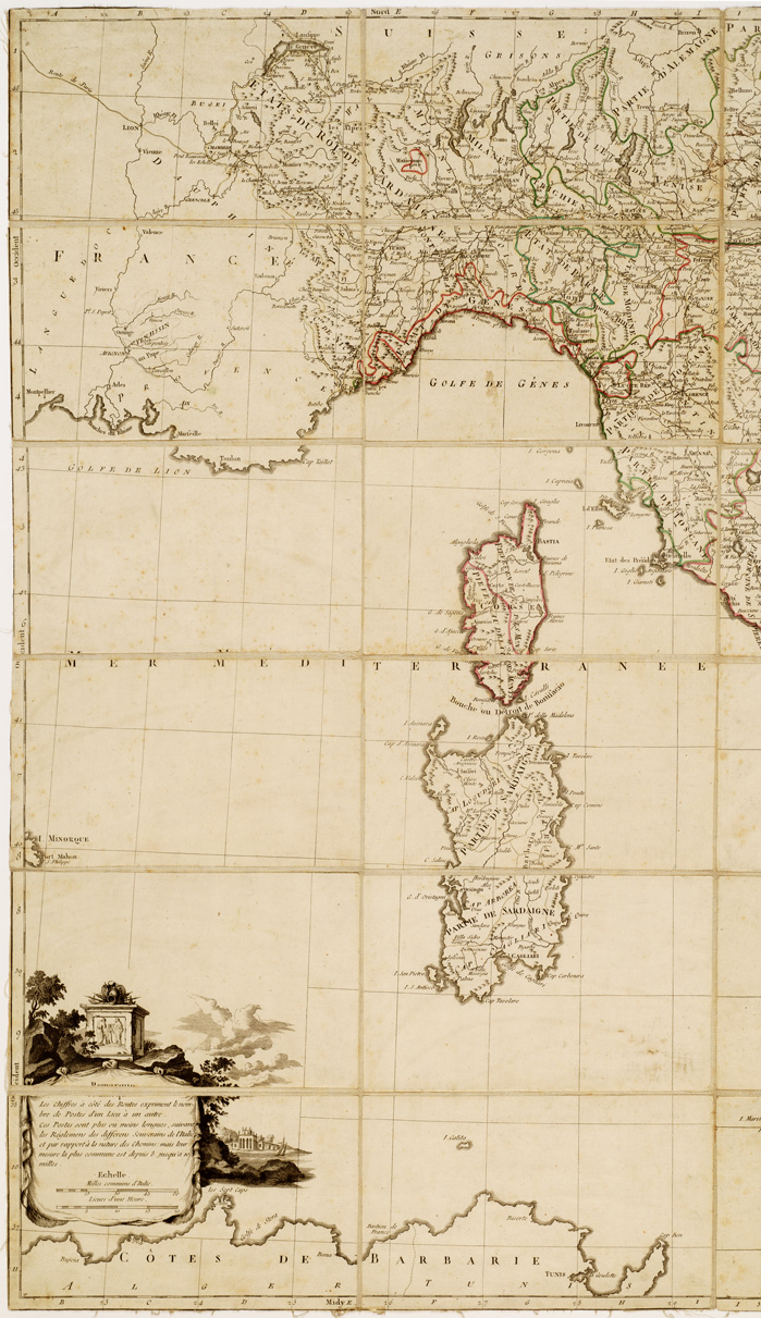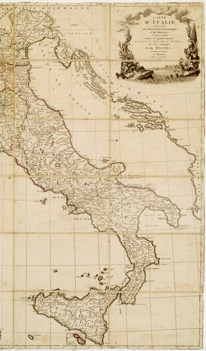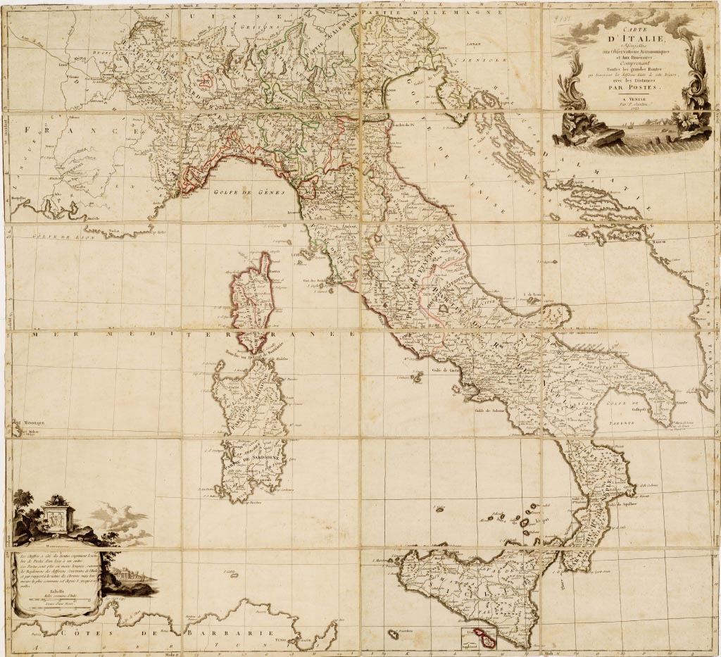 CARTE D'ITALIE ASSUJETTIE AUX OBSERVATIONS ASTRONOMIQUES ET AUX ITINERAIRES COMPRENANT TOUTES LES GRANDES ROUTES QUI TRAVERSENT LES DIFFERENS ETATS DE CETTE REGION, AVEC LES DISTANCES PAR POSTES A VENISE PAR P. SANTINI.
