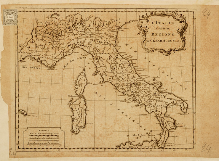 "Dello stesso documento la carta: "CARTE DE L'ANCIENNE ITALIE" (Coll. Bianconi n. 24bis). Due carte incise su rame appartenti a qualche pubblicazione di carattere storico come si deduce dall'indicazione posta su ambedue, in alto a sinistra, (tome IX, p. 348 e tome VIII, p. 1). Proiezione conica. Longitudini riferite all'Isola del Ferro. Orografia prospettica a monticelli. Toponomastica in latino eccetto i nomi dei mari e qualche altro nome in francese."