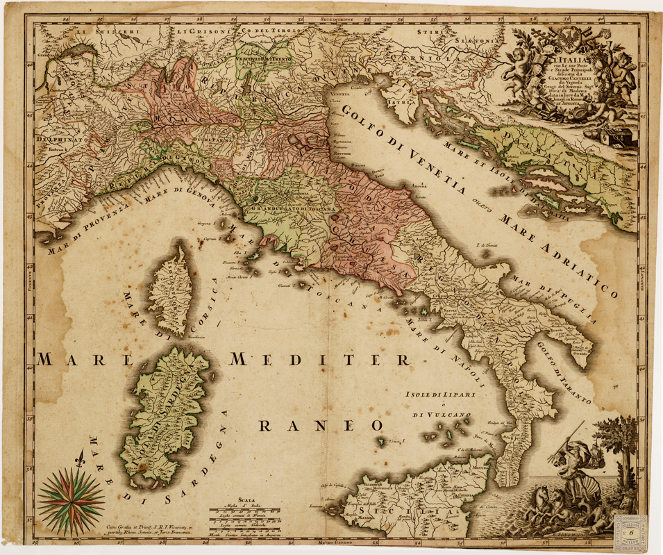 "...DESCRITTA DA GIACOMO CANTELLI DA VIGNOLA GEOGR. DEL SERENIS. SIG. DUCA DI MODENA DATA IN LUCE DA M. S. INTANGL. IN RAME IN AUGUSTA (s. d.). Carta incisa da Matth. Seutter. Longitudini provenienti dall'isola del Ferro. Orografia prospettica a monticelli. Nelle isole di Sicilia. Nelle isole di Sicilia, Sardegna e Corsica non è tracciata la rete stradale. Territori e confini statali a colori. "