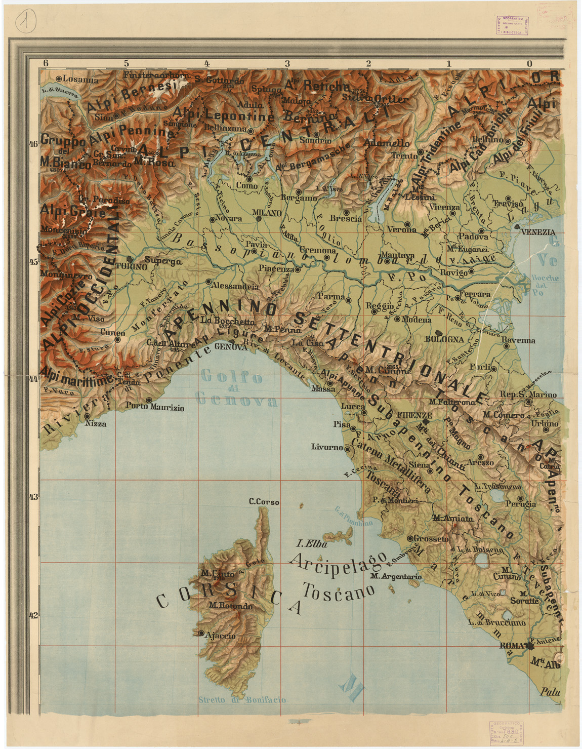 "Rappresentazione orografica a tratteggio. Il lato dei quadrati rossi è di 100 kilometri da Roma. I vari colori rappresentano le altezze in metri sul livello del mare. Dis. G. E. Fritzsche, Dir. F. Porena e C. Fochi. Istituto Cartografico Italiano, Roma. Editore: Loreto Pasqualucci, Roma. "