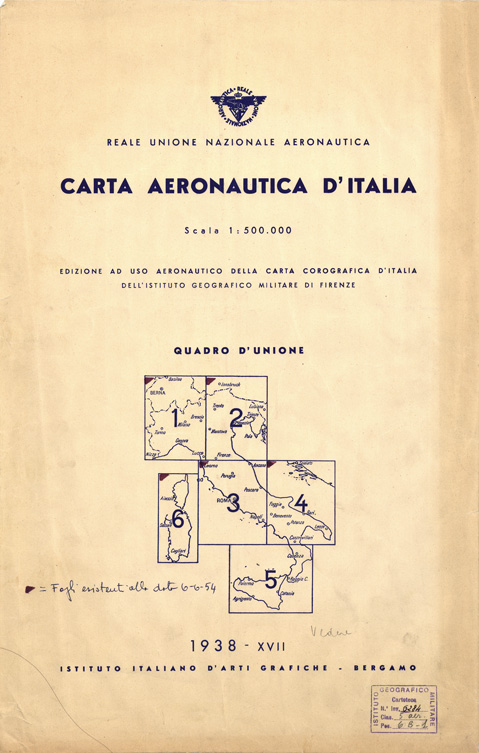 "Edizione ad uso aeronautico della carta corografica d'Italia dell'I.G.M. di Firenze. Reale Unione Nazionale Aeronautica. Istituto Italiano d'Arti Grafiche, Bergamo. Originariamente carta in sei fogli più il quadro d'unione i fogli esistenti al 6 giugno 1954 sono: 1, 2, 3, 4, 6 ed il quadro d'unione."