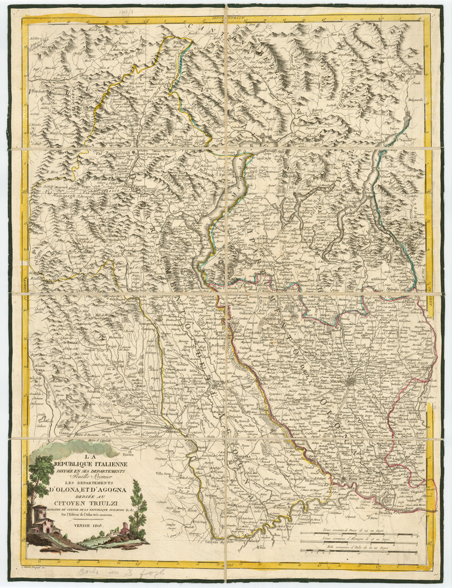 "1) FEUILLE PREMIER. LES DEPARTEMENTS D'OLONA, ET D'AGOGNA DEDIEE AU CITOYEN TRIULZI MINISTRE DE GUERRE DE LA REPUBLIQUE ITALIENNE ECC. PAR L'EDITEUR DE L'ATLAS TRES NOUVEAU 2) FEUILLE SECONDE. LES DEPARTEMENTS DU PANARO, ET DU CROSTOLO, DEDIEE, ECC. 3) FEUILLE TROISIEME. LES DEPARTEMENTS DU RENO, RUBICONE ET BASSO PO, DEDIEE, ECC. VENEZIA. Sono tre fogli incisi su rame e montati su tela a stacchi. Il foglio 1 è inciso da G. Valerio Pasquali il 2 da G. Bonatti il 3, manca della firma dell'incisore. Longitudini derivate dal meridiano dell'Isola del Ferro. Orografia prospettica. Centri abitati principali rappresentati schematicamente in pianta gli altri con circolini distinti secondo la loro importanza amministrativa. Ricca l'idrografia. Sono tracciate le strade. Confini a colori. Scale grafiche in leghe di Francia e di Germania, e in miglia italiane. Cfr. MARINELLI, Saggio, n. 1422."