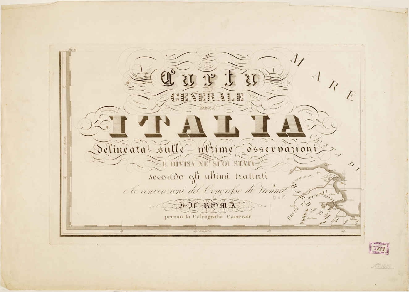 "...DELINEATA SULLE ULTIME OSSERVAZIONI E DIVISA NE'SUOI STATI SECONDO GLI ULTIMI TRATTATI E LE CONVENZIONI DEL CONGRESSO DI VIENNA. Incisione su rame. Carta composta da 15 fogli rappresentazione orografica dimostrativa. Roma, presso la Calcografia Camerale."