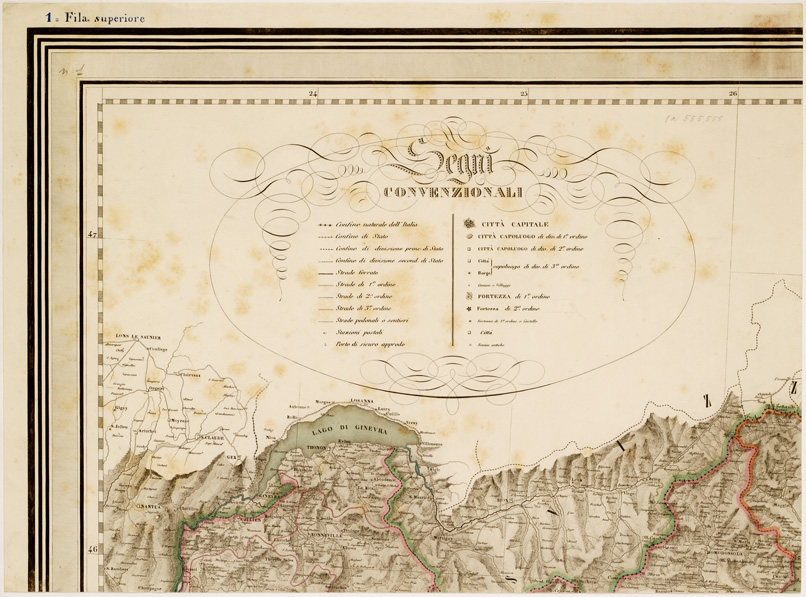 "... E DAI MEDESIMI DEDICATA ALL'ILLUSTRE GEOGRAFO ITALIANO BALBI CONSIGLIERE IMPERIALE DI S.M.I.R.A., ECC., ECC. MILANO, ING. FALCHI DIRESSE IL LAVORO. DISEGNO' VALMAGINI E CIVELLI. INCIS. BINDER CASTELLI PAVESI E ZUCCHI. Carta in 28 fogli incisi su rame. Orientamento normale longitudini dal meridiano di Parigi orografia a tratteggio fine, a luce obliqua. Abitati distinti secondo la loro importanza amministrativa. Sono segnate le fortezze (1° e 2° ordine e 3° ordine o castello), le rovine antiche, le stazioni di posta, i porti di sicuro approdo, le strade (classificate in quattro categorie) e le ferrovie. Confini politici e amministrativi segnati a colori. Acque costiere e la ghi colorati in azzurro, con filaggio. La carta si estende a parte della Francia, Svizzera, Dalmazia, Algeria e Tunisia. Il foglio contiene la leggenda dei segni convenzionali i fogli n. 2 e 3 un panorama prospettico a colori della "Elevazione sopra il livello del mare dei principali Monti d'Italia situati alla loro longitudine e loro altezza in metri" i fogli n. 4 e 8 recano il titolo il foglio n. 21 un prospetto politico dell'Italia il foglio n. 28 le scale grafiche in miglia italiane, chilometri, e miglia di Germania e di Francia. Cfr. MARINELLI, Saggio, ecc., n. 1733. La stessa carta è nella Collezione Bianconi sotto il numero 16."