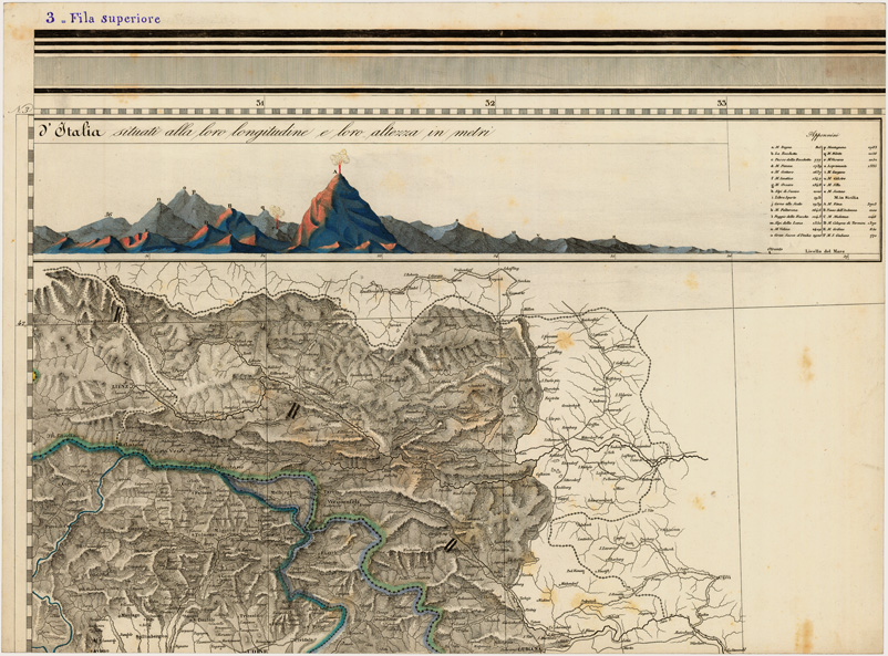 "... E DAI MEDESIMI DEDICATA ALL'ILLUSTRE GEOGRAFO ITALIANO BALBI CONSIGLIERE IMPERIALE DI S.M.I.R.A., ECC., ECC. MILANO, ING. FALCHI DIRESSE IL LAVORO. DISEGNO' VALMAGINI E CIVELLI. INCIS. BINDER CASTELLI PAVESI E ZUCCHI. Carta in 28 fogli incisi su rame. Orientamento normale longitudini dal meridiano di Parigi orografia a tratteggio fine, a luce obliqua. Abitati distinti secondo la loro importanza amministrativa. Sono segnate le fortezze (1° e 2° ordine e 3° ordine o castello), le rovine antiche, le stazioni di posta, i porti di sicuro approdo, le strade (classificate in quattro categorie) e le ferrovie. Confini politici e amministrativi segnati a colori. Acque costiere e la ghi colorati in azzurro, con filaggio. La carta si estende a parte della Francia, Svizzera, Dalmazia, Algeria e Tunisia. Il foglio contiene la leggenda dei segni convenzionali i fogli n. 2 e 3 un panorama prospettico a colori della "Elevazione sopra il livello del mare dei principali Monti d'Italia situati alla loro longitudine e loro altezza in metri" i fogli n. 4 e 8 recano il titolo il foglio n. 21 un prospetto politico dell'Italia il foglio n. 28 le scale grafiche in miglia italiane, chilometri, e miglia di Germania e di Francia. Cfr. MARINELLI, Saggio, ecc., n. 1733. La stessa carta è nella Collezione Bianconi sotto il numero 16."