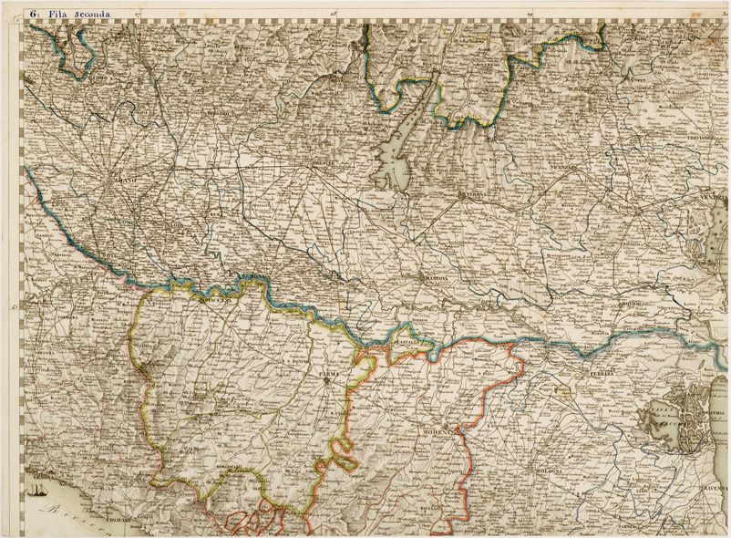 "… E DAI MEDESIMI DEDICATA ALL'ILLUSTRE GEOGRAFO ITALIANO BALBI CONSIGLIERE IMPERIALE DI S.M.I.R.A., ECC., ECC. MILANO, ING. FALCHI DIRESSE IL LAVORO. DISEGNO' VALMAGINI E CIVELLI. INCIS. BINDER CASTELLI PAVESI E ZUCCHI. Carta in 28 fogli incisi su rame. Orientamento normale longitudini dal meridiano di Parigi orografia a tratteggio fine, a luce obliqua. Abitati distinti secondo la loro importanza amministrativa. Sono segnate le fortezze (1° e 2° ordine e 3° ordine o castello), le rovine antiche, le stazioni di posta, i porti di sicuro approdo, le strade (classificate in quattro categorie) e le ferrovie. Confini politici e amministrativi segnati a colori. Acque costiere e la ghi colorati in azzurro, con filaggio. La carta si estende a parte della Francia, Svizzera, Dalmazia, Algeria e Tunisia. Il foglio contiene la leggenda dei segni convenzionali i fogli n. 2 e 3 un panorama prospettico a colori della "Elevazione sopra il livello del mare dei principali Monti d'Italia situati alla loro longitudine e loro altezza in metri" i fogli n. 4 e 8 recano il titolo il foglio n. 21 un prospetto politico dell'Italia il foglio n. 28 le scale grafiche in miglia italiane, chilometri, e miglia di Germania e di Francia. Cfr. MARINELLI, Saggio, ecc., n. 1733. La stessa carta è nella Collezione Bianconi sotto il numero 16."