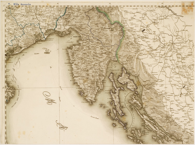 "… E DAI MEDESIMI DEDICATA ALL'ILLUSTRE GEOGRAFO ITALIANO BALBI CONSIGLIERE IMPERIALE DI S.M.I.R.A., ECC., ECC. MILANO, ING. FALCHI DIRESSE IL LAVORO. DISEGNO' VALMAGINI E CIVELLI. INCIS. BINDER CASTELLI PAVESI E ZUCCHI. Carta in 28 fogli incisi su rame. Orientamento normale longitudini dal meridiano di Parigi orografia a tratteggio fine, a luce obliqua. Abitati distinti secondo la loro importanza amministrativa. Sono segnate le fortezze (1° e 2° ordine e 3° ordine o castello), le rovine antiche, le stazioni di posta, i porti di sicuro approdo, le strade (classificate in quattro categorie) e le ferrovie. Confini politici e amministrativi segnati a colori. Acque costiere e la ghi colorati in azzurro, con filaggio. La carta si estende a parte della Francia, Svizzera, Dalmazia, Algeria e Tunisia. Il foglio contiene la leggenda dei segni convenzionali i fogli n. 2 e 3 un panorama prospettico a colori della "Elevazione sopra il livello del mare dei principali Monti d'Italia situati alla loro longitudine e loro altezza in metri" i fogli n. 4 e 8 recano il titolo il foglio n. 21 un prospetto politico dell'Italia il foglio n. 28 le scale grafiche in miglia italiane, chilometri, e miglia di Germania e di Francia. Cfr. MARINELLI, Saggio, ecc., n. 1733. La stessa carta è nella Collezione Bianconi sotto il numero 16."