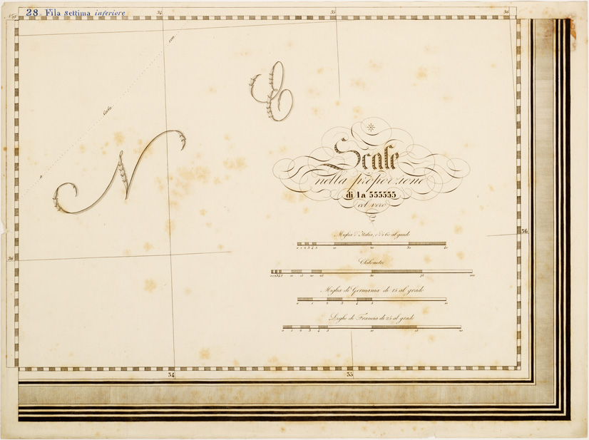 "... E DAI MEDESIMI DEDICATA ALL'ILLUSTRE GEOGRAFO ITALIANO BALBI CONSIGLIERE IMPERIALE DI S.M.I.R.A., ECC., ECC. MILANO, ING. FALCHI DIRESSE IL LAVORO. DISEGNO' VALMAGINI E CIVELLI. INCIS. BINDER CASTELLI PAVESI E ZUCCHI. Carta in 28 fogli incisi su rame. Orientamento normale longitudini dal meridiano di Parigi orografia a tratteggio fine, a luce obliqua. Abitati distinti secondo la loro importanza amministrativa. Sono segnate le fortezze (1° e 2° ordine e 3° ordine o castello), le rovine antiche, le stazioni di posta, i porti di sicuro approdo, le strade (classificate in quattro categorie) e le ferrovie. Confini politici e amministrativi segnati a colori. Acque costiere e la ghi colorati in azzurro, con filaggio. La carta si estende a parte della Francia, Svizzera, Dalmazia, Algeria e Tunisia. Il foglio contiene la leggenda dei segni convenzionali i fogli n. 2 e 3 un panorama prospettico a colori della "Elevazione sopra il livello del mare dei principali Monti d'Italia situati alla loro longitudine e loro altezza in metri" i fogli n. 4 e 8 recano il titolo il foglio n. 21 un prospetto politico dell'Italia il foglio n. 28 le scale grafiche in miglia italiane, chilometri, e miglia di Germania e di Francia. Cfr. MARINELLI, Saggio, ecc., n. 1733. La stessa carta è nella Collezione Bianconi sotto il numero 16."