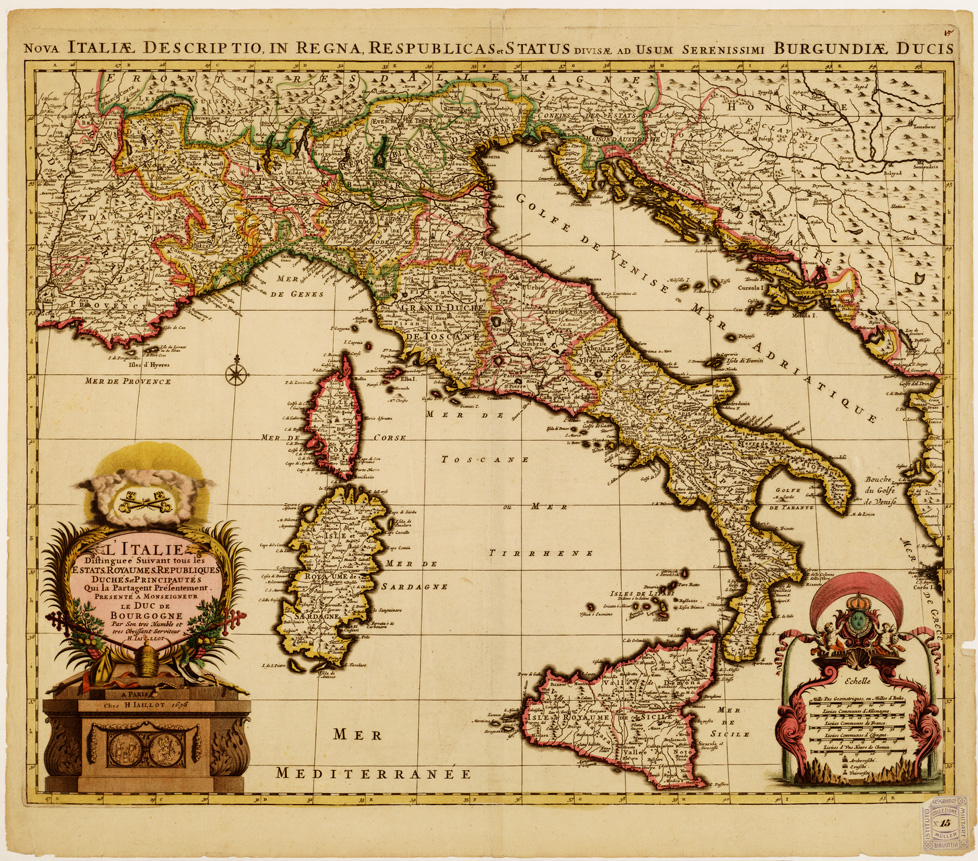 L'ITALIE DISTINGUEE SUIVANT TOUS LES ESTATS ROYAUME, REPUBLIQUES, DUCHES ET PRINCIPAUTES QUI LA PARTAGENTS PRESENTEMENT, ECC.