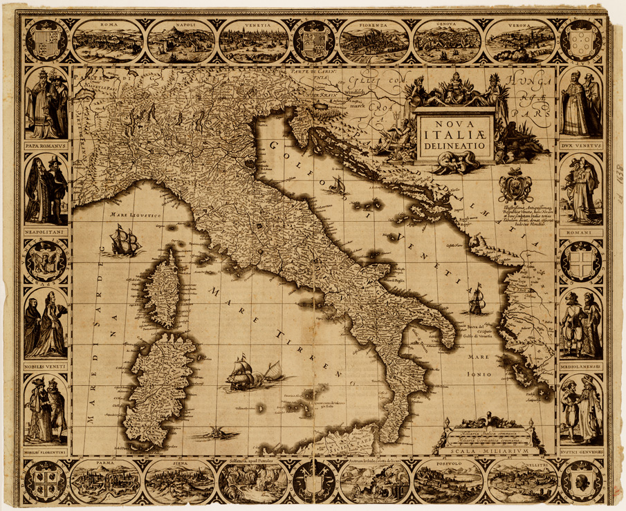 "Tavola 4 - Ha per titolo "DESCRIPTIO ITALIAE". Testo spiegativo esterno in latino. Titolo interno "NOVA ITALIAE DELINEATIO". E' dedicata alla Repubblica Veneta dall'incisore Jodoco Hondio. Carta artisticamente bellissima ed interessante per la sua relativa esattezza (v. n. 8 d'ordine, Coll. Muller n. 2 - CARTE VARI TRATTE DALL'ATLANTE DI GIOVANNI JANNSON). E' munita di due scale: Miliaria Italica communia e Miliaria Germanica communia. L'intero Documento è composto dalle seguenti Tavole: Tavola 1 - "VIRO ANTIQUA DOMO GENEROSO...THEODORICO CLUVERO" Tavola 2 - "STATO DELLA CHIESA - DOMINIUM ECCLESIASTICUM IN ITALIA" - File B0008169 Tavola 3 - "ITALIA NUOVAMENTE PIU' PERFETTA CHE MAI..." - File B0008726 Tavola 4 - "NOVA ITALIAE DELINEATIO" - File B0008266 Jodoco Hondio (1563-1611). Successe negli affari dell'azienda editoriale al cognato Rumoldus Mercator e venne così in possesso delle celebri tavole di Gherardo Mercatore. Fu però egli stesso un incisore valentissimo, superiore anzi come cartografo ai suoi predecessori. Fondò la serie degli Atlanti Hondius Mercator (iniziantesi con la seconda edizione del grande Mercatore) cui egli apportò il tributo delle nuove conoscenze e innovazione di metodi. Il suo monumentale lavoro venne proseguito dal figlio Enrico Hondius e dal genero Joannes Jansonius e pubblicato in altre due dozzine di eizioni in più lingue."