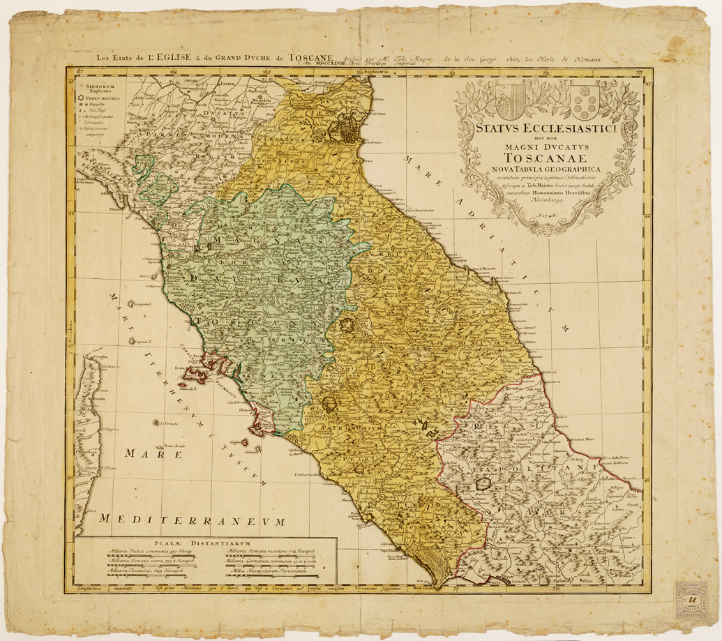 "...NOVA TABULA GEOGRAPHICA SECUNDUM PRINCIPIA LEGITIMAE DELINEATIONIS DESCRIPTA A TOB. MAJERO, SOCIET. GEOGR. SODALI CURANTIBUS HOMANNIANIS HEREDIBUS NORIMBERGAE A. 1748. Incisione su rame in foglio unico con titolo ripetuto in francese fuori del campo disegnato in alto. Orientazione normale. Proiezione conica. Longitudini riferite al meridiano dell'isola del Ferro. Orografia prospettica a monticelli. Abitati principali rappresentati in pianta: i secondari con torri e case. E' tracciata la rete stradale. Toponomastica in italiano con nomi regionali in latino. Territori e confini statali a colori. Sei scale grafiche in misure antiche. A sinistra in alto la leggenda dei segni convenzionali. Limiti: nord, il Po sud, Gaeta ovest, Sestri di Levante est, Termoli. Cfr. ALMAGIA' R., L'Italia di G. A. Magini, ecc., pag. 131 e 137."