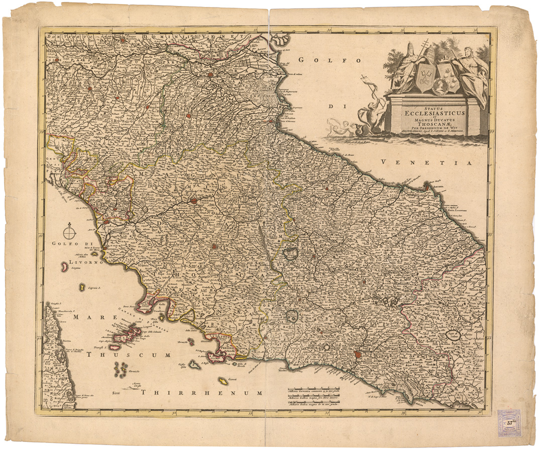 "...PER FREDERICUM DE WIT AMSTELODAMI APUD I. COVENS ET C. MORTIER. Foglio unico inciso su rame. Orientazione normale. Longitudini calcolate dalle isole del Capo Verde. Limiti: nord, Mantova sud, Gaeta ovest, Spezia est, Civita di Pena. Orografia prospettica a monticelli. Abitati importanti rappresentati schematicamente in pianta e riempiti in rosso, gli altri con torri e case. Manca la rete stradale. Confini statali a colori nella copia n. 37 bis e fondo dei territori statali a colori nella copia n. 37 (File B00012915) Cfr. ARRIGONI e BERTARELLI, Le carte geografiche dell'Italia, ecc., n. 2088. Cfr. anche la stessa carta al numero di File B0007244 - Coll. Muller n. 38."