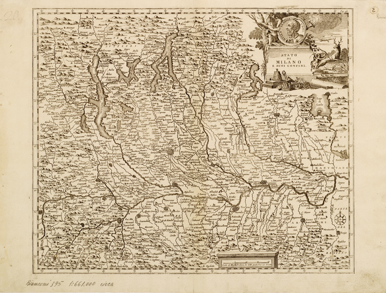 "Gruppo di tredici carte, sette delle quali relative alla regione Lombardo-Veneta. Sono le stesse carte di cui al n. 393 Collez. Bianconi, n. 18 d'ordine. Incisione su rame. Rappresentazione orografica prospettica. Scala grafica di miglia italiane, 60 delle quali fanno un Grado. La scala è scritta a matita sulla carta. Grafia in lingua italiana e latina."