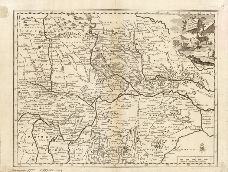 CARTE GEOGRAFICHE DI VARIE REGIONI D'ITALIA SIMILI A QUELLE PUBBLICATE NELLE OPERE DEL SALMO DI GEOGRAFIA IN VENEZIA, 1757 - Tavola 5 - Carta geografica del Ducato di Mantoua