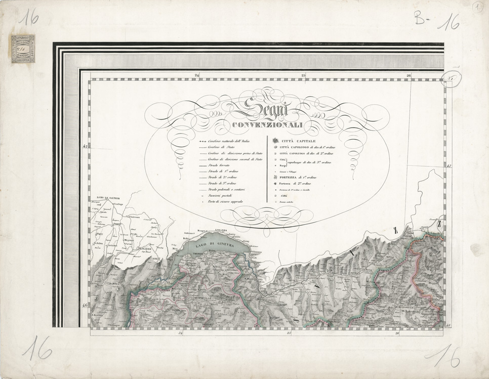 "… E DAI MEDESIMI DEDICATA ALL'ILLUSTRE GEOGRAFO ITALIANO BALBI CONSIGLIERE IMPERIALE DI S.M.I.R.A., ECC., ECC.. MILANO, ING. FALCHI DIRESSE IL LAVORO. DISEGNO' VALMAGINI E CIVELLI. INCIS. BINDER CASTELLI PAVESI E ZUCCHI. Carta in 28 fogli incisi su rame. L'intera carta misura cm 186x237. Orientamento normale longitudini dal meridiano di Parigi orografia a tratteggio fine, a luce obliqua. Abitati distinti secondo la loro importanza amministrativa. Sono segnate le fortezze (1° e 2° ordine e 3° ordine o castello), le rovine antiche, le stazioni di posta, i porti di sicuro approdo, le strade (classificate in quattro categorie) e le ferrovie. Confini politici e amministrativi segnati a colori. Acque costiere e laghi colorati in azzurro, con filaggio. La carta si estende a parte della Francia, Svizzera, Dalmazia, Algeria e Tunisia. Il foglio n. 1 contiene la leggenda dei segni convenzionali i fogli n. 2 e 3 un panorama prospettico a colori della "Elevazione sopra il livello del mare dei principali Monti d'Italia situati alla loro longitudine e loro altezza in metri" i fogli n. 4 e 8 recano il titolo il foglio n. 21 un prospetto politico dell'Italia il foglio n. 28 le scale grafiche in miglia italiane, chilometri, e miglia di Germania e di Francia. Cfr. MARINELLI, Saggio, ecc., n. 1733. Vedi copia identica nella Collezione Pasqui n. 1."