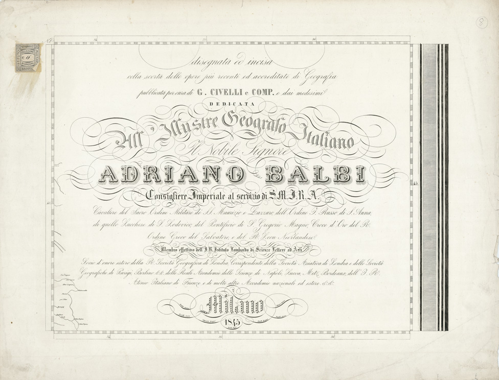 "… E DAI MEDESIMI DEDICATA ALL'ILLUSTRE GEOGRAFO ITALIANO BALBI CONSIGLIERE IMPERIALE DI S.M.I.R.A., ECC., ECC.. MILANO, ING. FALCHI DIRESSE IL LAVORO. DISEGNO' VALMAGINI E CIVELLI. INCIS. BINDER CASTELLI PAVESI E ZUCCHI. Carta in 28 fogli incisi su rame. L'intera carta misura cm 186x237. Orientamento normale longitudini dal meridiano di Parigi orografia a tratteggio fine, a luce obliqua. Abitati distinti secondo la loro importanza amministrativa. Sono segnate le fortezze (1° e 2° ordine e 3° ordine o castello), le rovine antiche, le stazioni di posta, i porti di sicuro approdo, le strade (classificate in quattro categorie) e le ferrovie. Confini politici e amministrativi segnati a colori. Acque costiere e laghi colorati in azzurro, con filaggio. La carta si estende a parte della Francia, Svizzera, Dalmazia, Algeria e Tunisia. Il foglio n. 1 contiene la leggenda dei segni convenzionali i fogli n. 2 e 3 un panorama prospettico a colori della "Elevazione sopra il livello del mare dei principali Monti d'Italia situati alla loro longitudine e loro altezza in metri" i fogli n. 4 e 8 recano il titolo il foglio n. 21 un prospetto politico dell'Italia il foglio n. 28 le scale grafiche in miglia italiane, chilometri, e miglia di Germania e di Francia. Cfr. MARINELLI, Saggio, ecc., n. 1733. Vedi copia identica nella Collezione Pasqui n. 1."