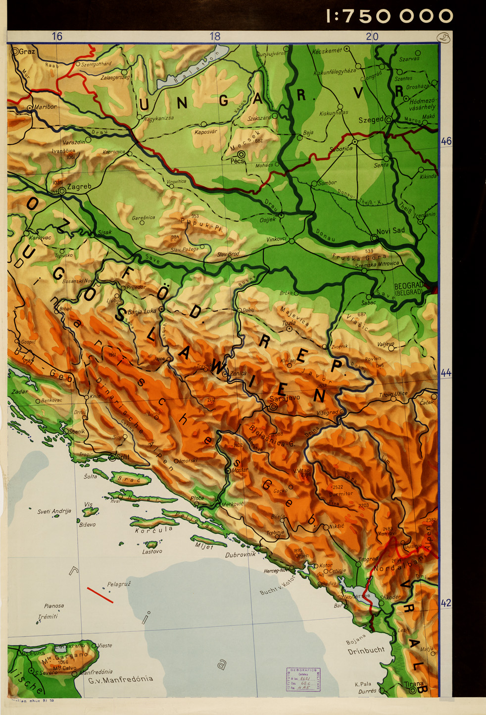 "Rappresentazione orografica a tinte ipsometriche. In basso è presente la spiegazione delle tinte ipsometriche. Veb Hermann Haack Geographisch-Kartographische Anstalt Gotha, Leipzig."