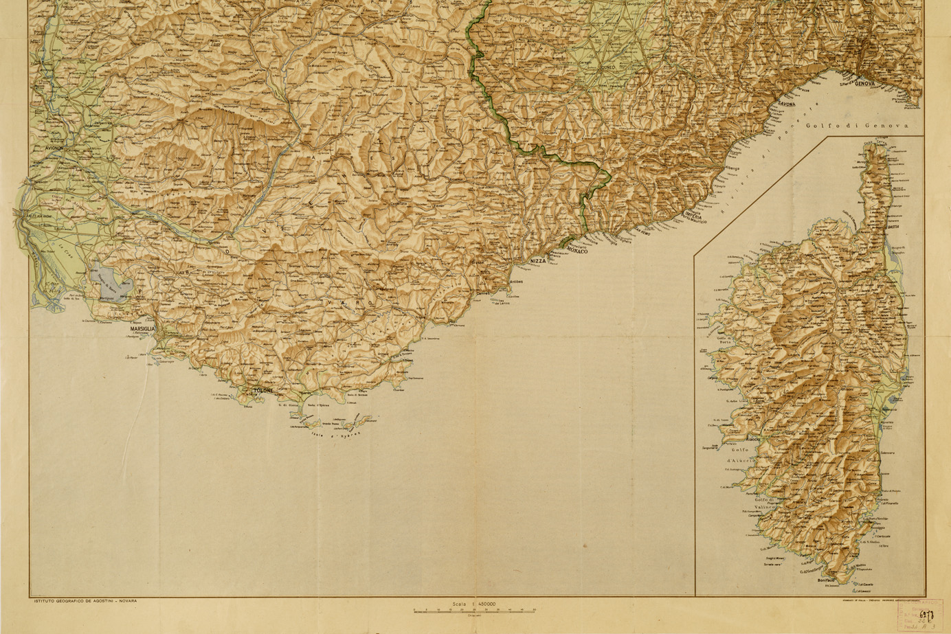 "Rappresentazione orografica a sfumo. Nel riquadro in basso a destra è presente la Corsica. Istituto Geografico De Agostini, Novara."