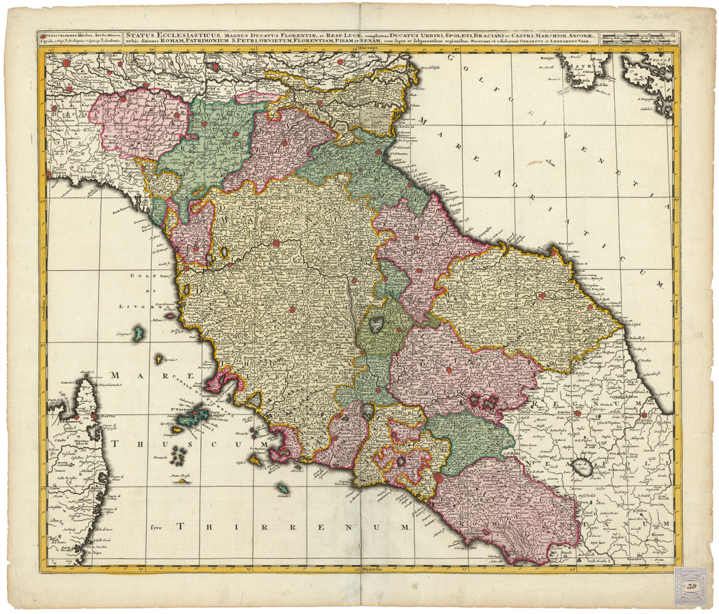 "...ET RESP. LUCAE COMPLECTENS DUCATUS URBINI, SPOLETI, BRACIANI, ET CASTRI, MARCHION, ANCONAE, URBIS DITIONES ROMAN, PATRIMONIUM S. PETRI, ORVETIUM, FLORENTIAM, PISAM ET SENAM, CUM SUPRA ET SUBJACENTIBUS REGIONIBUS. FECERUNT ET EDITERUNT GERARDUS ET LEONARDUS VALK. Foglio unico tratto da incisione su rame. Orientazione normale. Proiezione conica. Longitudini derivate dal meridiano dell'Isola del Ferro. Orografia prospettica a monticelli. Centri abitati importanti rappresentati in pianta e riempiti in rosso: gli altri con torri e case o circolini. Manca la rete stradale. Territori e confini statali a colori."