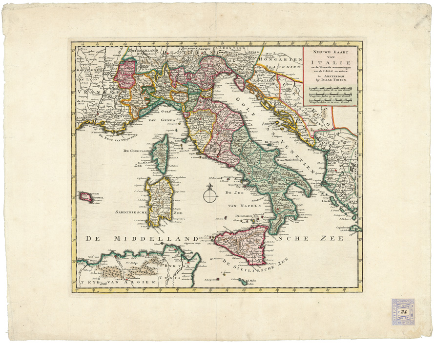 "...NA DE NIEUWSTE WAARNEMINGEN VAN DE L'ISLE EN ANDERE TE AMSTERDAM BY ISAAK TIRION (NUOVA CARTA D'ITALIA IN BASE AI PIU' RECENTI RILIEVI FATTI DA L'ISLE ED ALTRI. AMSTERDAM, DA ISAAK TIRION). Una riduzione della carta del Delisle di cui al n. 36 d'ordine n. 20 Collezione Muller - File B0007262. Proiezione conica meridiano centrale 30°. Orientazione normale. Longitudini riferite all'isola del Ferro. Limiti: est, Brescon nord, Gr. Brenner ovest, Cephalonia sud, Is. Malta. Toponomastica parte in olandese e parte in italiano."