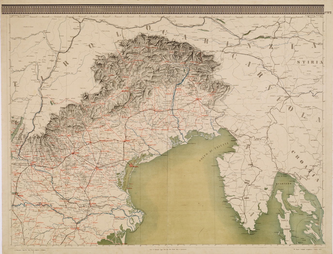 "...DEDICATA ALL'ONOREVOLE SIGNOR CAVALIERE GIOVANNI BARBAVARA DI GRAVELLONA SENATORE DEL REGNO E DA QUATTRO LUSTRI DIRETTORE GENERALE DELLE POSTE DAL CAV.RE FELICE SALIVETTO CAPO SEZIONE NELL'AMMINISTRAZIONE POSTALE IL QUALE IDEò E PROMOSSE UNA TALE CARTA E DA DOMENICO MARCHISIO SEGRETARIO NELL'AMMINISTRAZIONE STESSA IL QUALE COMPOSELA E DISEGNO' ESEGUITA E PUBBLICATA DALLA LITOGRAFIA FRATELLI DOYEN IN TORINO PREMIATA CON MEDAGLIA ALL'ESPOSIZIONE UNIVERSALE E INTERNAZIONALE DI PARIGI DEL 1878 Rappresentazione orografica a sfumo. Sotto al titolo la spiegazione dei segni. Carta in 15 fogli. Torino."