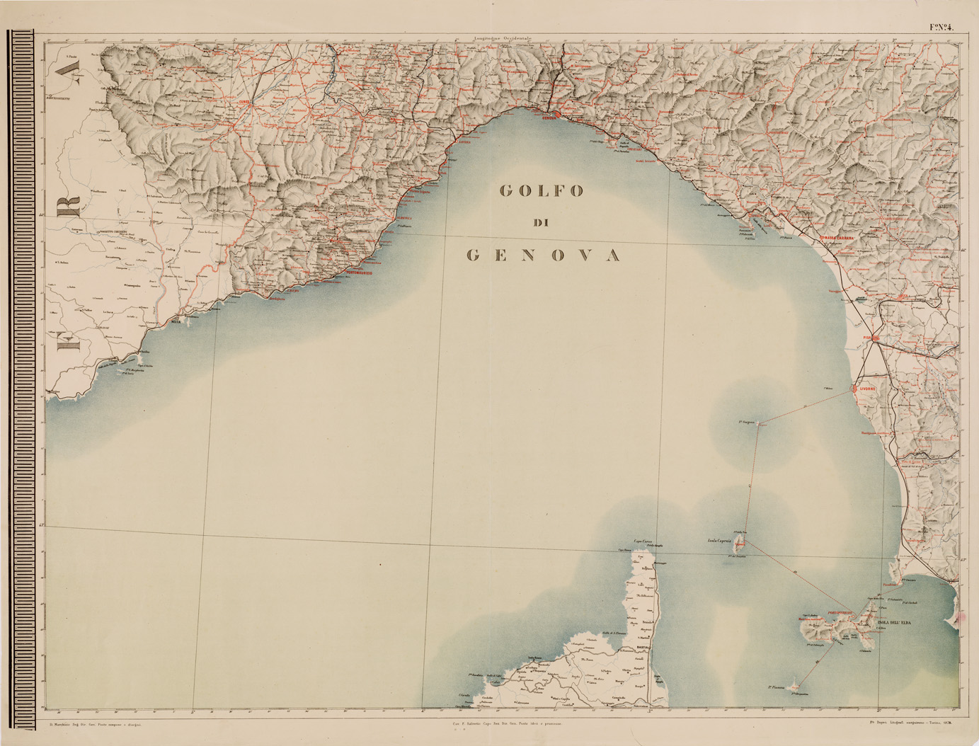 "...DEDICATA ALL'ONOREVOLE SIGNOR CAVALIERE GIOVANNI BARBAVARA DI GRAVELLONA SENATORE DEL REGNO E DA QUATTRO LUSTRI DIRETTORE GENERALE DELLE POSTE DAL CAV.RE FELICE SALIVETTO CAPO SEZIONE NELL'AMMINISTRAZIONE POSTALE IL QUALE IDEò E PROMOSSE UNA TALE CARTA E DA DOMENICO MARCHISIO SEGRETARIO NELL'AMMINISTRAZIONE STESSA IL QUALE COMPOSELA E DISEGNO' ESEGUITA E PUBBLICATA DALLA LITOGRAFIA FRATELLI DOYEN IN TORINO PREMIATA CON MEDAGLIA ALL'ESPOSIZIONE UNIVERSALE E INTERNAZIONALE DI PARIGI DEL 1878 Rappresentazione orografica a sfumo. Sotto al titolo la spiegazione dei segni. Carta in 15 fogli. Torino."