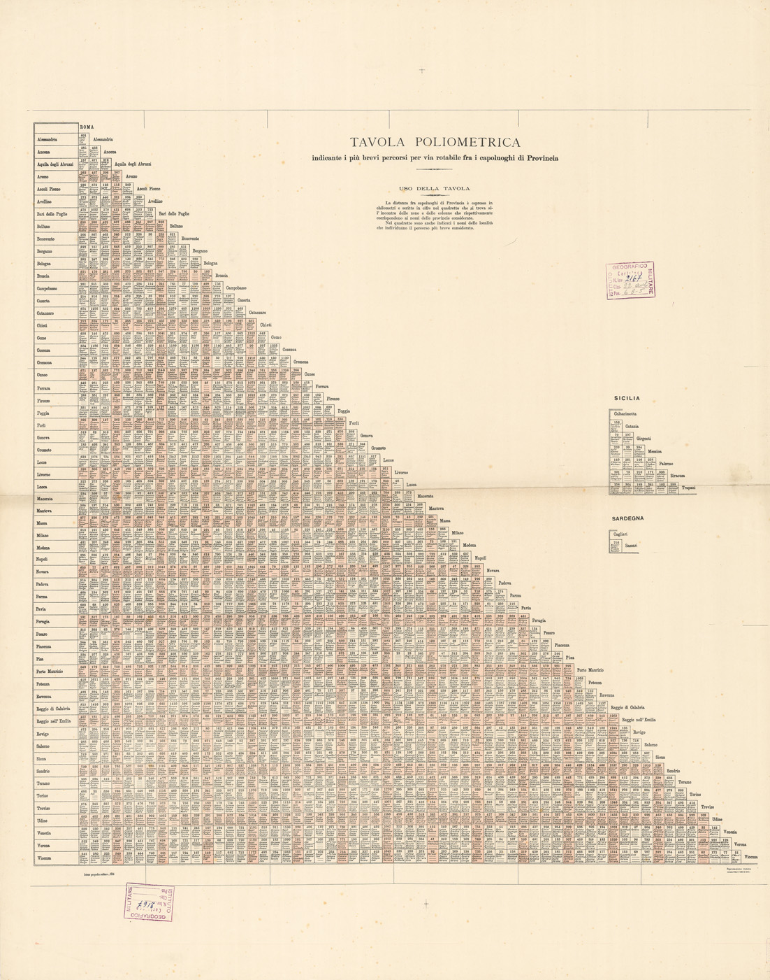 "Tavola poliometrica indicante i più brevi percorsi per via rotabile fra i capoluoghi di Provincia. La distanza fra i capoluoghi di Provincia è espressa in chilometri e scritta in cifre nel quadretto che si trova all'incontro delle zone e delle colonne che rispettivamente corrispondono ai nomi delle provincie considerate. Nel quadretto sono anche indicati i nomi delle località che individuano il percorso più breve considerato."
