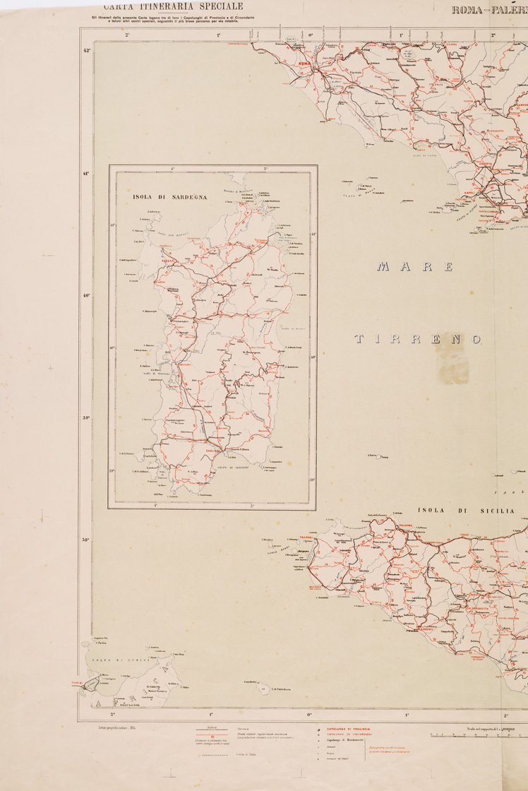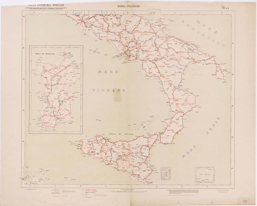 "Gli itinerari della presente carta legano tra di loro i Capoluoghi di Provincia e di Circondario e taluni altri centri speciali, seguendo il più breve percorso per via rotabile. Rappresentaziopne orografica planimetrica. In basso la spiegazione dei segni convenzionali. Nel riquadro è presente la Sardegna nel riquadro in basso a destra le isole Pelagie. I.G.M. (FI)."